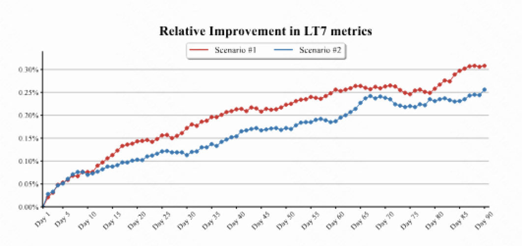 下面的表格是 AB 实验的双重差分结果。可以看到,EMER 相较于融合公式的方法,在推荐系统的核心指标如 LT、时长、vv 和互动等指标上都取得了显著的提升!而目前的 LT 折线图结果则表明,LT 仍然有不断上升的趋势。