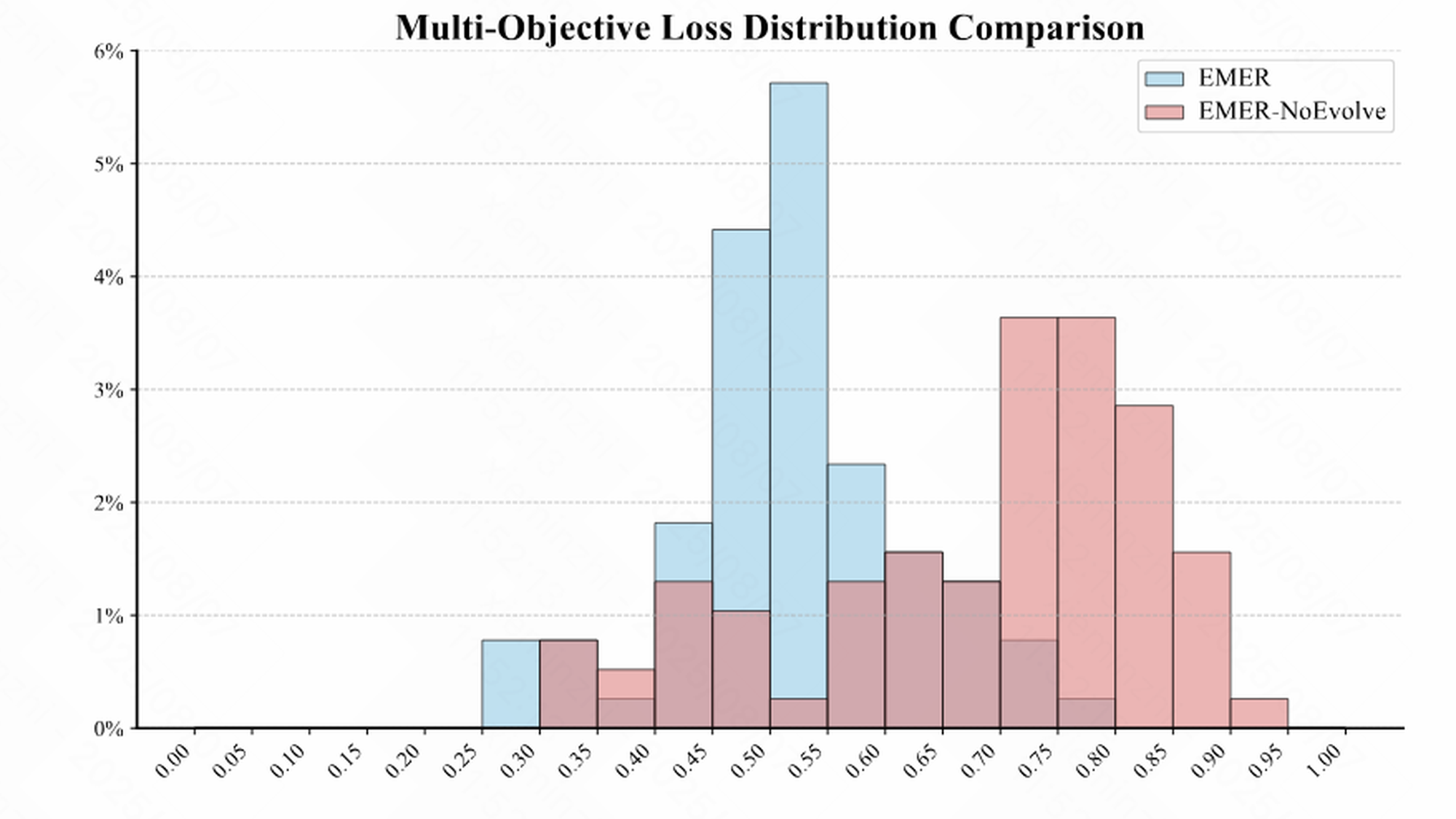 进一步分析(见图 1)表明,EMER 的多目标损失分布更均匀、集中且整体值更低,而 EMER-NoEvolve 损失波动大、分布分散。这说明这说明,自进化机制不只是在“调权重”,更是在持续引导模型的学习方向,避免某些目标“抢跑”或“躺平”,提升训练稳定性。