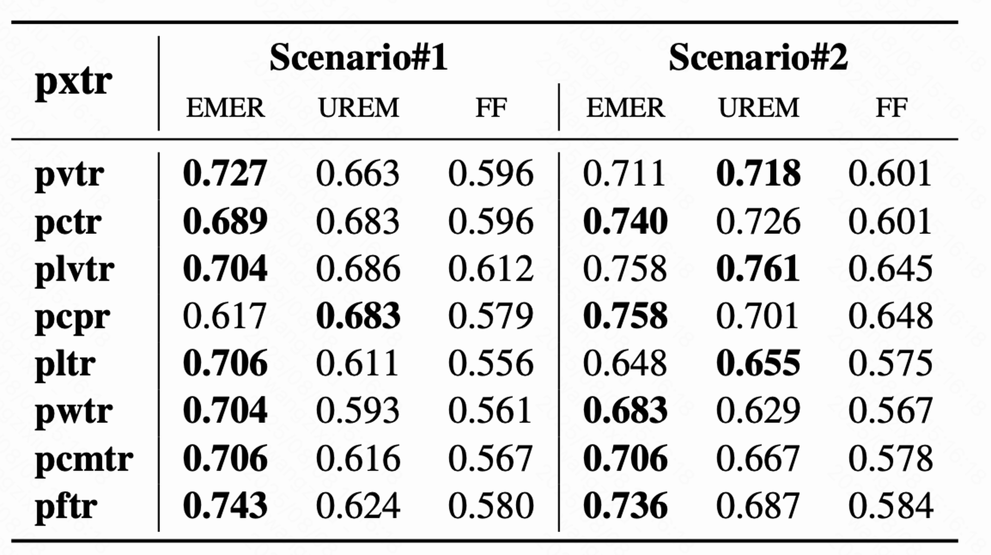 为了评估最终的排序结果和主要 PXTR 信号之间的一致性,我们计算了不同的排序融合方式得到的最终排序和不同 pxtr(主要包括观看时长 pvtr,有效播/长播/完播 pctr/plvtr/pcpr,点赞/关注/评论/转发 pltr/pwtr/pcmtr/pftr)之间的 GAUC。数据如下表(表中 UREM 为业界最新的使用模型融合的尝试)所示,EMER 方法得到的排序在大部分 pxtr 上均取得了最好的一致性。