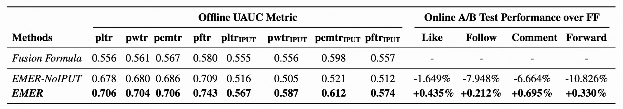 为验证 IPUT(单位时间交互概率)的作用,构建 EMER-NoIPUT。相比之下,基于 IPUT 构建的 ,其离线增益与线上表现高度一致。这说明 IPUT 通过建模即时反馈密度,有效对齐了离线训练目标与真实用户满意度,是保障模型实用性的关键设计。