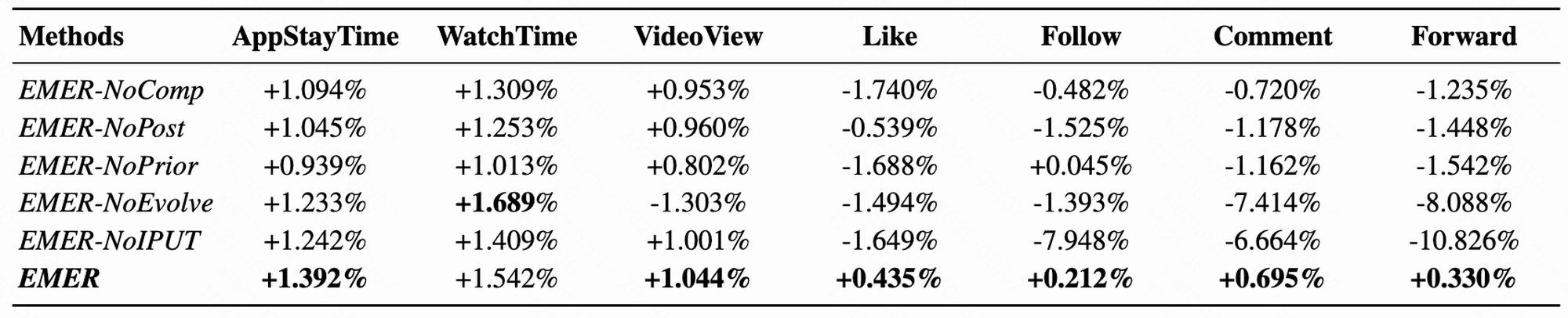 表 2:EMER 和消融版本的在线 A/B 效果比较