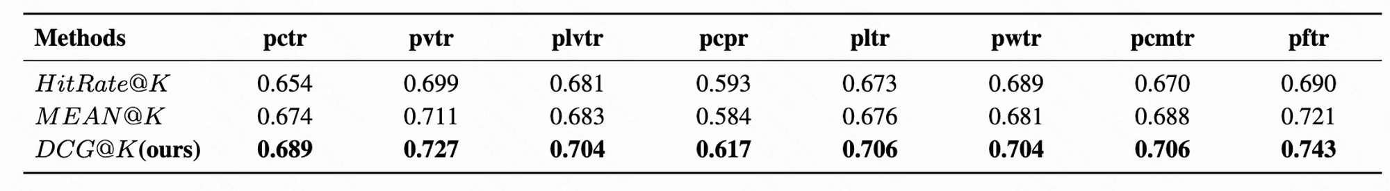 结果表明(见下表),DCG@K 在几乎所有 GAUC 指标上表现最佳。因其同时考虑 item 相关性与排序位置,更能反映真实场景下的用户注意力分布。最终,EMER 采用 DCG@K 作为优势评估的默认指标,以确保模型向“高质量 item 前置”的方向优化。