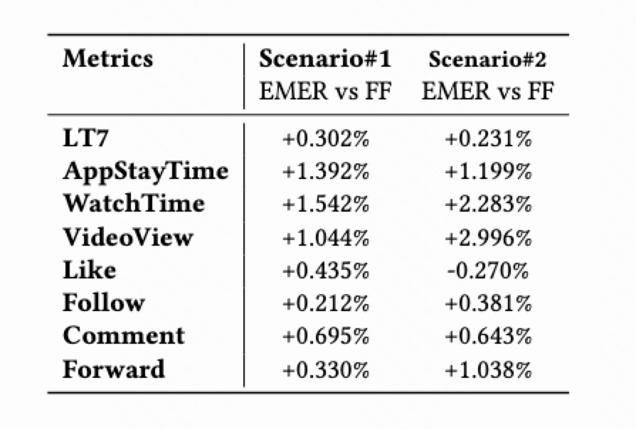 EMER 还适配到了快手端到端生成式推荐系统 OneRec 链路的奖励模型中,使得 App 停留时长提升 0.56%,留存有显著正向趋势,反转实验长期观察中。