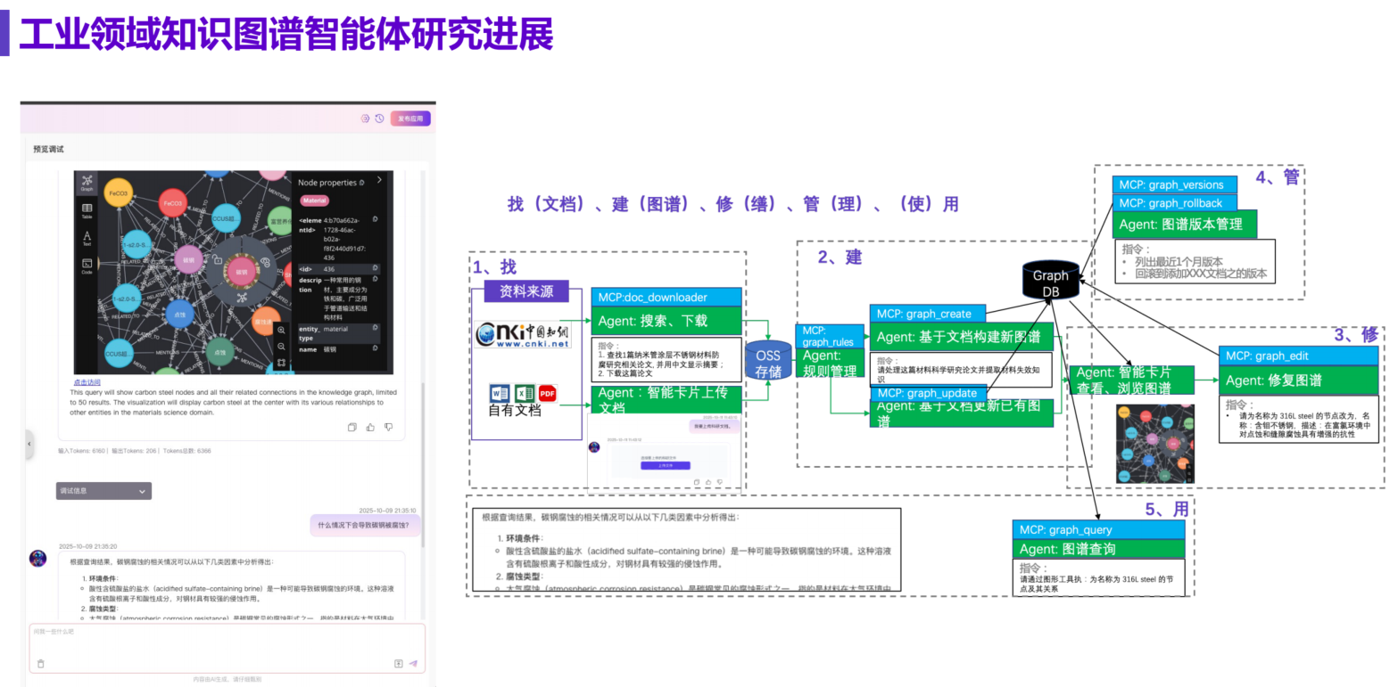 PLM 知识图谱智能体:工业知识的 “活仓库”该智能体构建了 “找 - 建 - 缮 - 管 - 用” 全流程能力:通过 MCP 文档下载器自动抓取工业手册、技术文档,基于大模型构建知识图谱;支持 NL2SQL 查询(如工程师提问 “碳钢腐蚀的环境因素”,智能体可快速定位 “酸性含硫酸盐盐水” 等关键信息);同时具备版本管理与修复功能,确保知识可沉淀、可复用,打破部门间的知识壁垒。