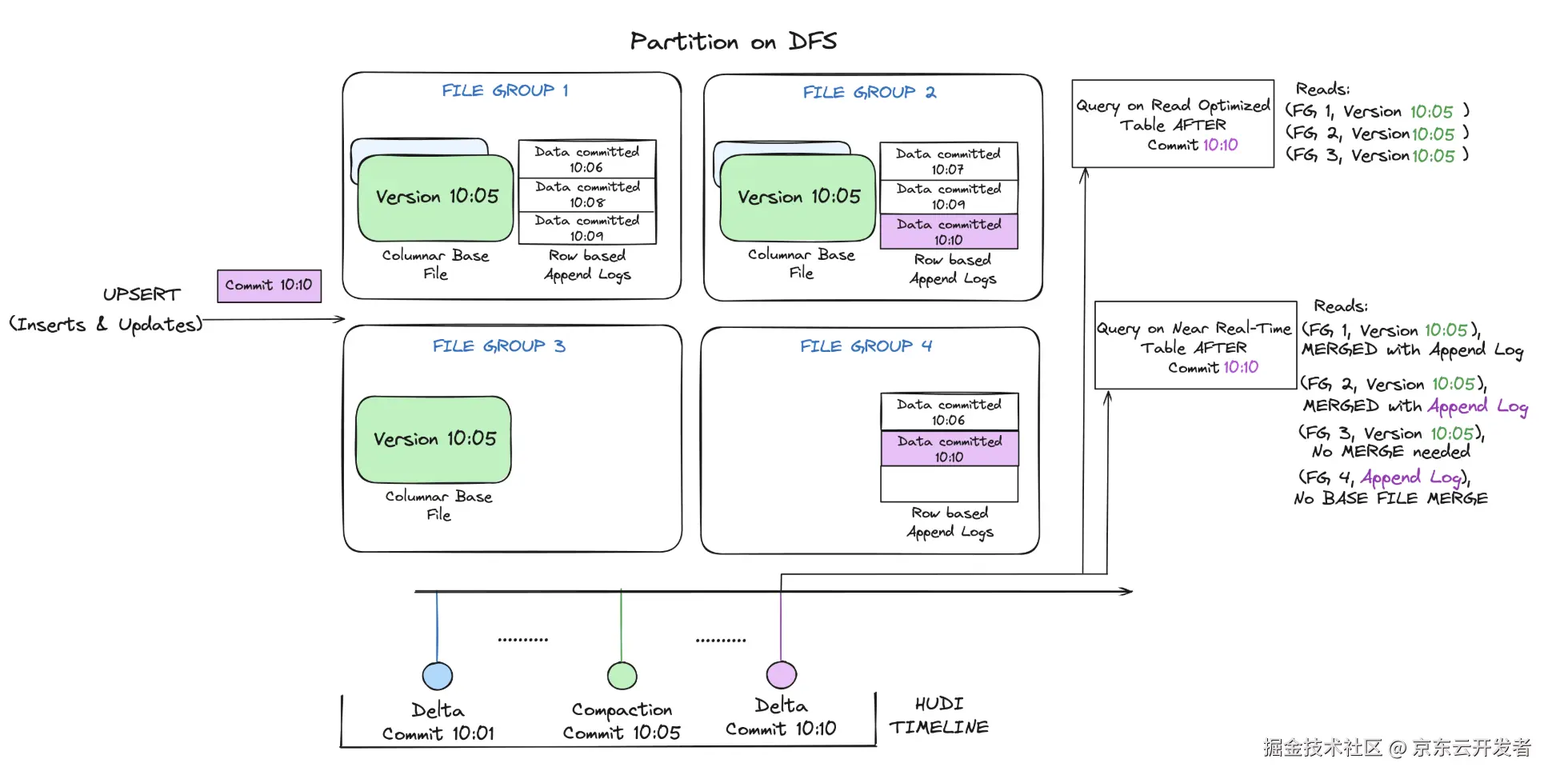 •Hudi 采用多版本并发控制 (MVCC),其中压缩操作合并日志和基本文件以生成新的文件切片,清理操作删除未使用/较旧的文件切片以回收文件系统上的空间。
