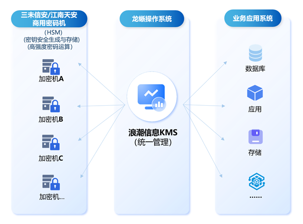 其中,安全联盟致力于联合龙蜥社区理事单位及国内安全领域企事业单位,携手将龙蜥操作系统打造成具备业界顶级安全水平的操作系统。当密钥管理面临日益复杂、安全要求持续提升的背景下,龙蜥社区安全联盟厂商浪潮信息、三未信安、江南天安三家企业基于安全联盟合作共同产出《KMS 多加密机聚合管理解决方案》,该方案通过融合三方专业能力,由三未信安、江南天安 HSM 提供业界领先的密码运算性能,以浪潮 KMS 优化调度,保障高并发业务需求。最终通过浪潮信息 KMS 单一平台,即可管理分散的 HSM 资源及其中的密钥,操作简便。