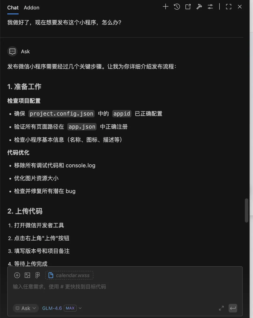 Ask 智能体为我生成了一份详尽的小程序发布指南,从发布前准备、代码上传、提交审核、注意事项到最终发布上线,每个步骤都讲解得清清楚楚。