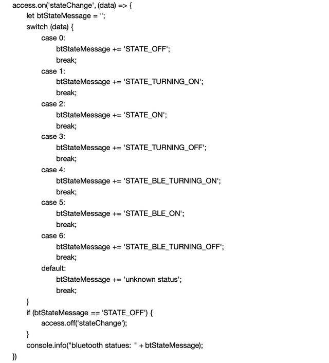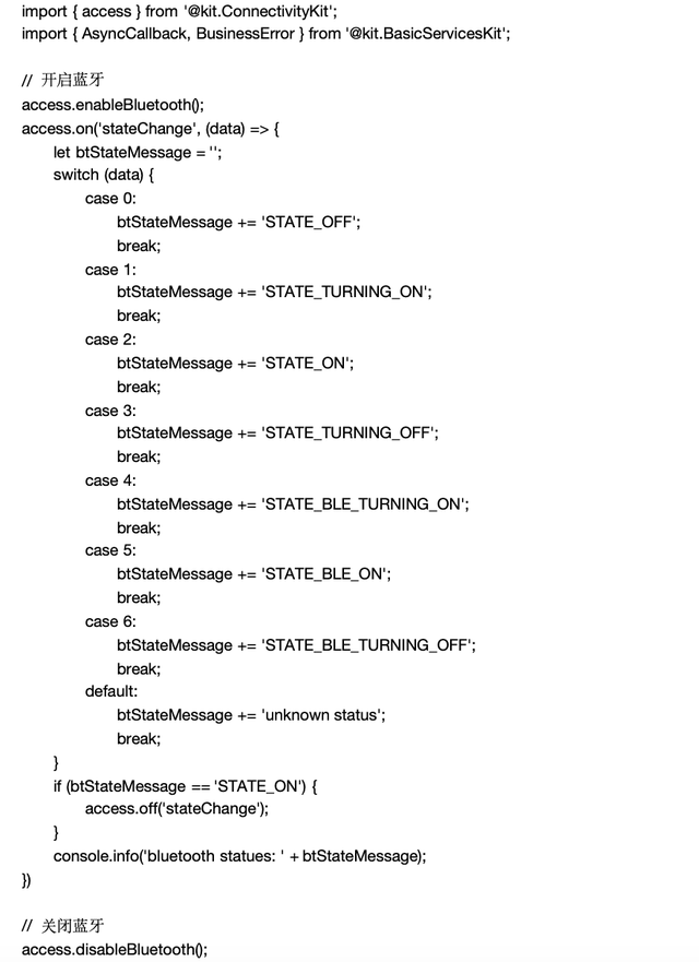 以下是一个简单的示例代码,展示了如何使用 Connectivity Kit 中的蓝牙 ACCESS 接入模块来开启和关闭蓝牙: