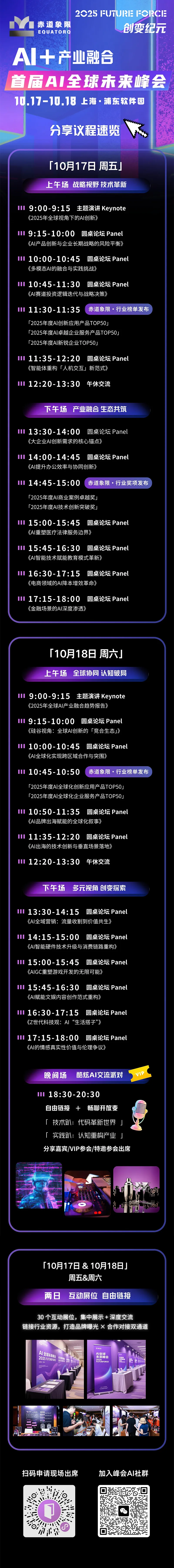 大半个 AI 圈大咖现场出席的 AI 行业峰会来袭!10.17-10.18 日连续两日,赤道象限 EquatorQ 将在上海主办呈现**《2025 创变纪元|AI 全球未来峰会》**。这是国内首场聚焦 AI+产业融合 的千人峰会,近百位嘉宾密集分享和观点碰撞,更有互动展位、创新项目路演和 AI 社交名片、AI 玄学解签、AI 峰会主持等超酷炫 AI 互动玩法。现场还将发布两份 AI 人工智能行业报告、五大 AI 人工智能行业榜单和两项 AI 人工智能行业奖项,邀你共同见证年度荣耀时刻。