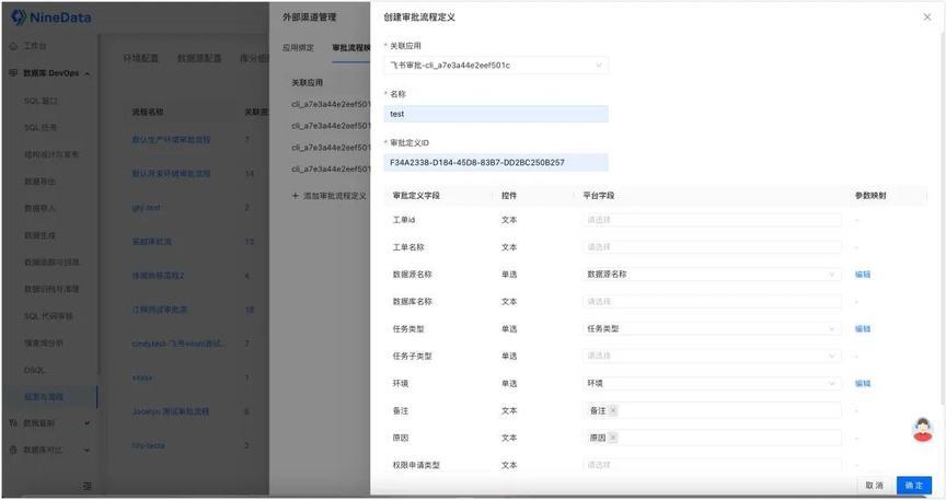 自定义审批模板:支持在飞书侧创建自定义审批模板,然后在 NineData 中关联该模板并逐个映射所有字段。