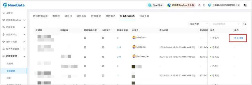 支持终止待执行的敏感数据扫描任务,操作入口位于任务扫描日志页签。