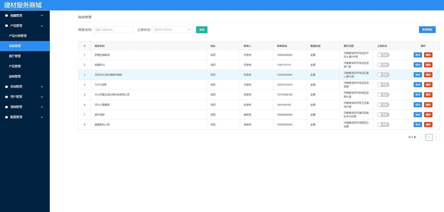商家管理:管理商家信息,包括商家入驻、资质审核和商家评级,以维护平台的商业生态,保障建材商家的合规性与服务质量。