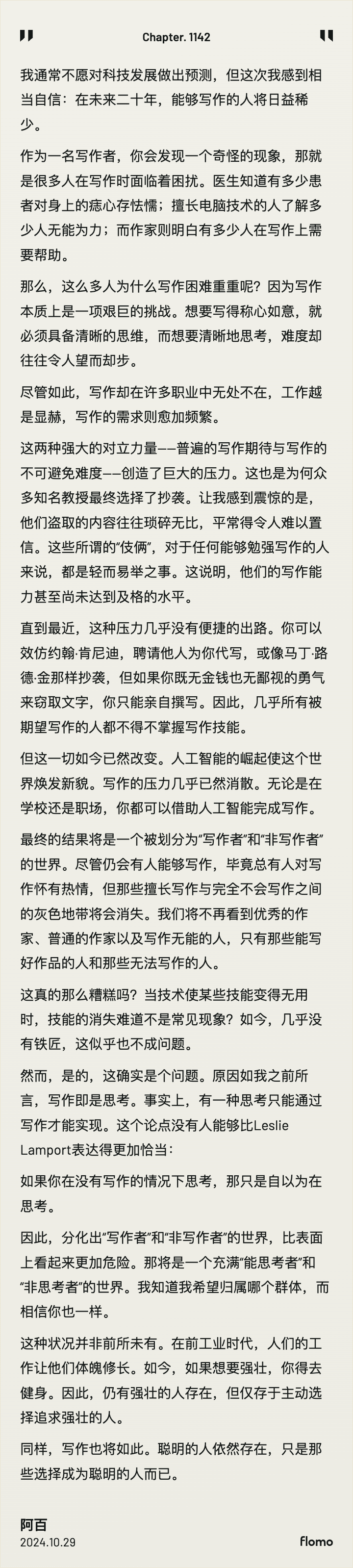 去年这个时候,阅读了保罗·格雷厄姆关于 AI 代替人类思考的分享,大意是“未来随着 AI 可以代写一切,写作也不会是必需品,人们会越来越倾向于使用 AI 代替思考。不写作的人将逐渐失去思考的能力,而继续写作的人,则成为未来真正的“聪明人”
