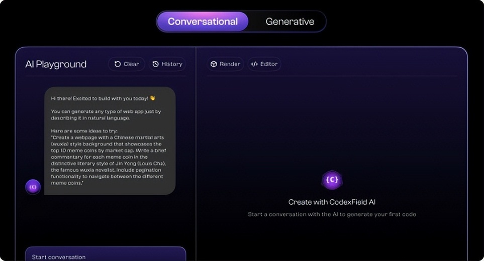AI Playground 是 CodexField 生态的创作与创新核心,为开发者与创作者提供一个集模型调用、AI 应用生成、内容创作与二次开发于一体的开放平台。它与底层的 Gitd 与 Greenfield 网络深度联动,使用户能够直接在浏览器中访问算力、调用模型,并在链上实现作品的即时存储与确权。无论是生成文本与图像,还是搭建完整的 AI 应用,用户都能在同一环境中完成创作、测试与发布,形成从灵感到上架的全流程闭环。