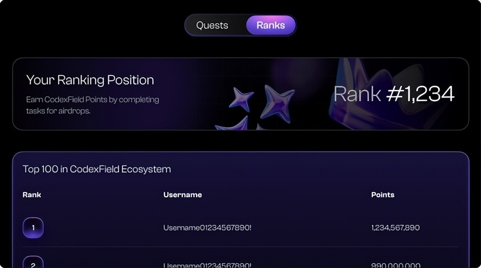 Quest & Rank 模块是 CodexField 面向用户增长与生态长期活跃度设计的激励系统。它通过将链上与链下的行为数据整合入统一任务体系,让用户在参与生态的每一步中都能获得量化激励与等级成长。无论是完成链上质押、交易操作,还是进行内容创作、社交互动,这些行为都将被系统识别并计入积分与排名,构建出一个以真实贡献为核心的动态奖励机制。