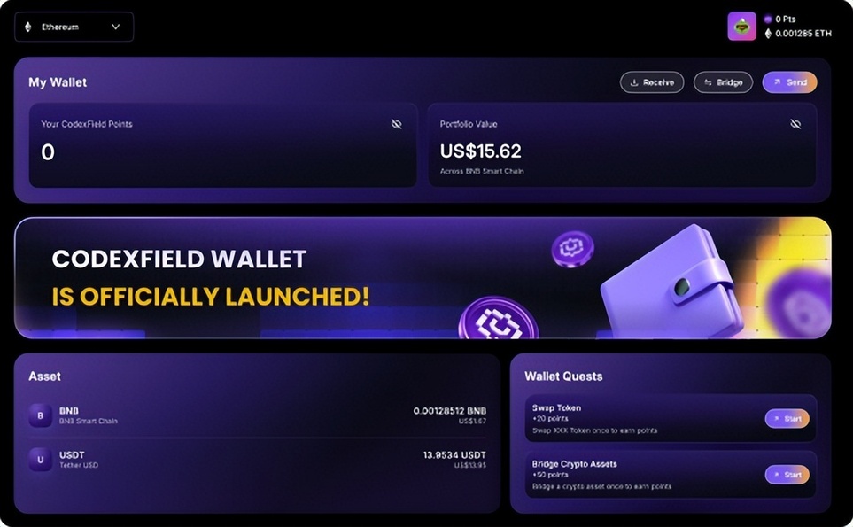 与传统钱包不同,CodexField Wallet 在设计之初就被定义为多链与多资产协作的基础设施。它支持以太坊、BNB Chain、Solana、Polygon 等主流公链及代币资产,并计划在未来版本中扩展至 Tron、Avalanche、Mantle、Base、Arbitrum、Sui 与 Aptos 等生态。同时,内置跨链桥功能可实现安全高效的资产迁移,让用户在不同网络之间自由切换,保持资金流动性的一致性。