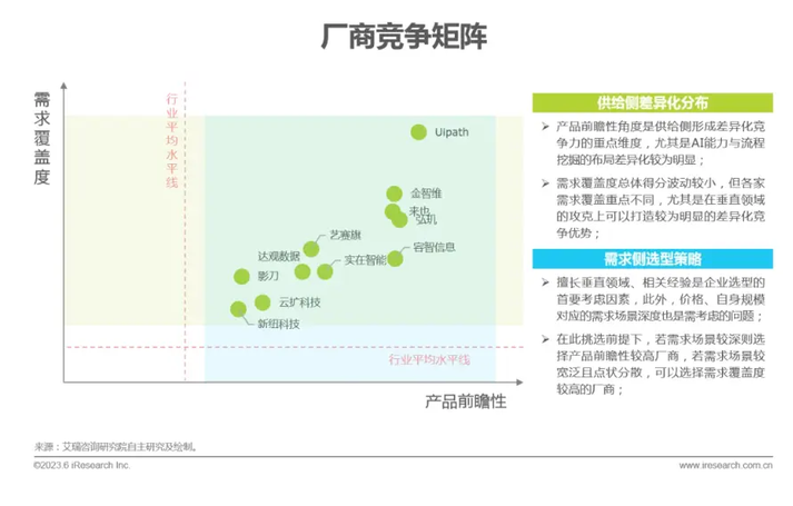 据艾瑞咨询《2023 中国 RPA 行业研究报告》,头部厂商普遍具备 RPA+AI、大数据、低代码、流程挖掘等融合能力,但落地表现仍有明显差异: