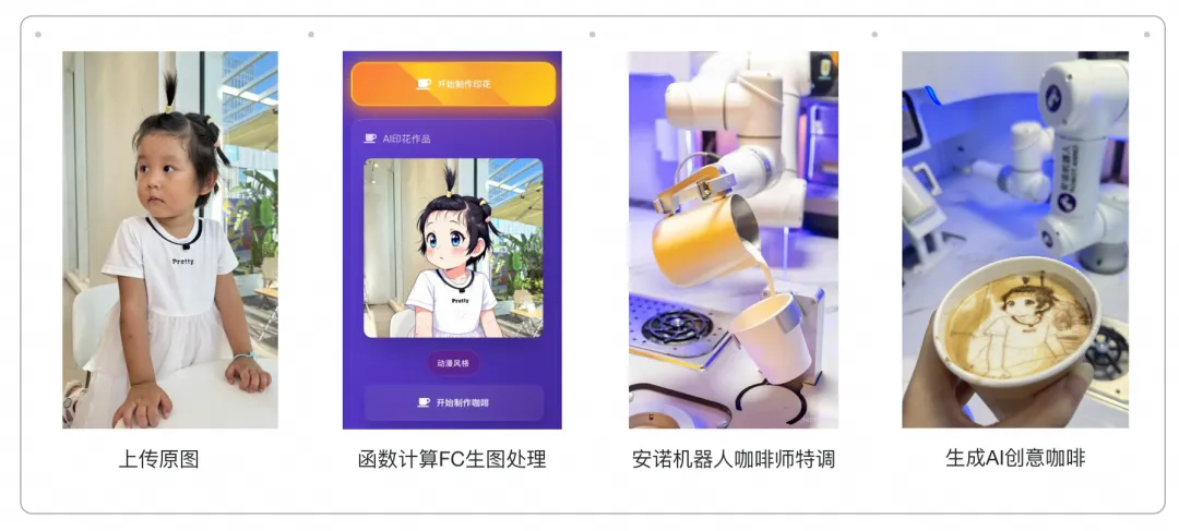 只需现场扫描二维码,上传一张自己的头像或喜欢的图片,就可以体验基于函数计算 FC 快速使用 ComfyUI +大模型实现 AI 生图, 将图片进行风格化处理后,再通过安诺机械臂和咖啡机制作成咖啡上面的印花,就可以见证你的专属 AI 画作,是如何被机器人精准复刻到咖啡上的。