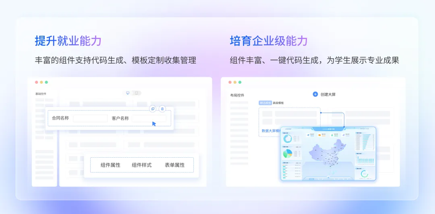 低代码开发平台非常适用国内高校,是“理论快速连接实践”的桥梁,让学生聚焦核心能力,快速积累“全栈”与“全生命周期”的“类企业级”项目经验。提升学生就业率与就业质量指标。