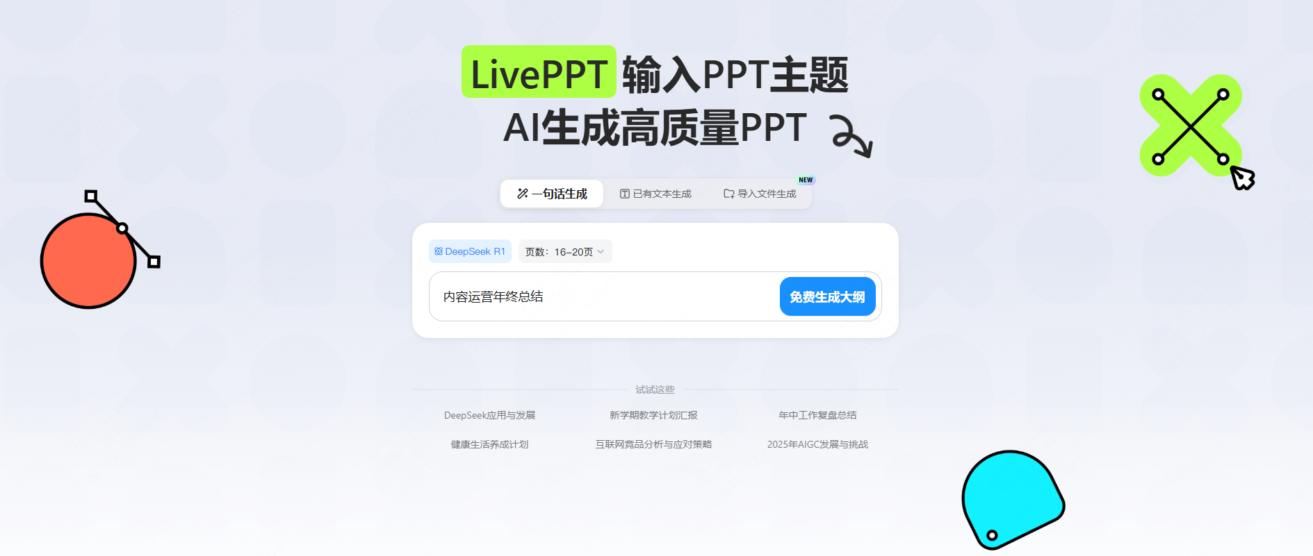 依托于美图秀秀强大的图像处理基因,美图 LivePPT 主打“简单、快速、美观”。美图 LivePPT 提供 3 种 PPT 生成方式,包括一句话生成、已有文本生成、导入文件生成,基本上可以覆盖绝大部分 PPT 制作需求。