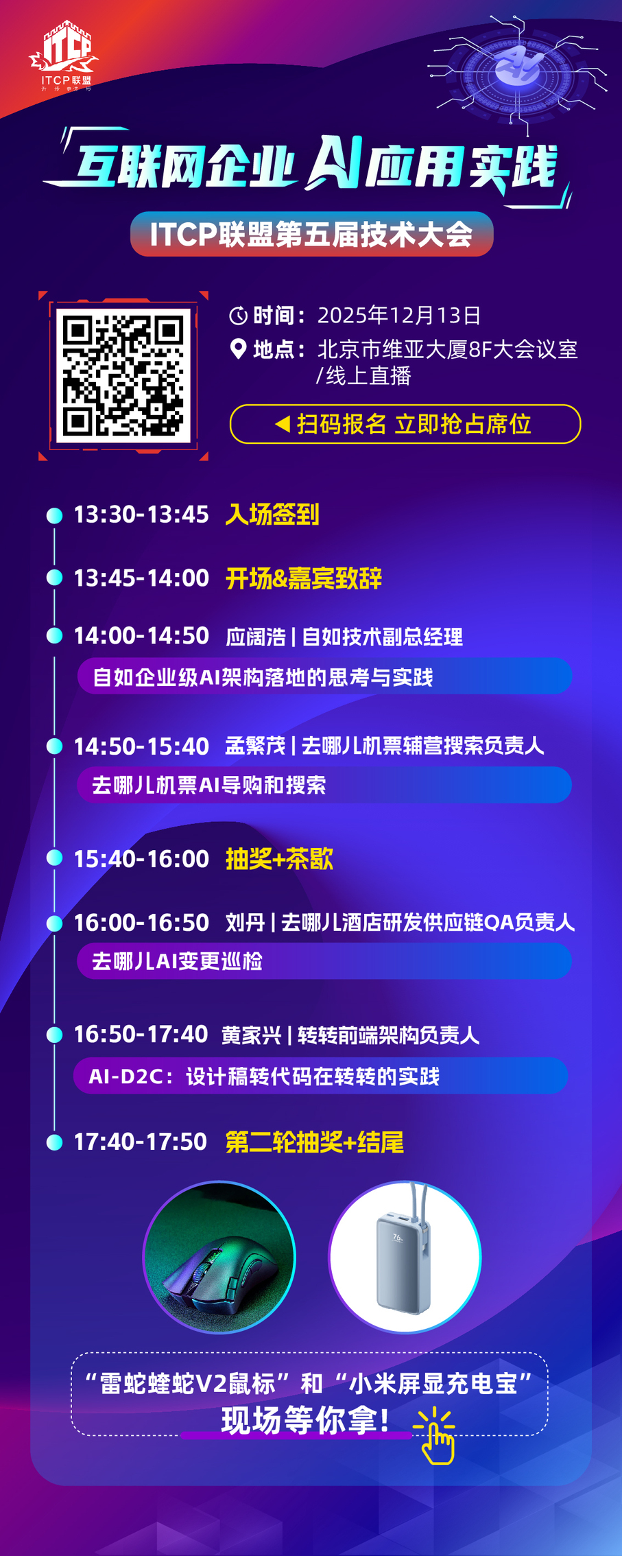 紧随【AI 基建专场】的精彩分享,12 月 13 日,去哪儿旅行携手转转、自如,重磅推出【AI 应用专场】。本专场将聚焦 AI 技术与业务场景的深度融合,共同分享 AI 落地过程中的关键技术突破、场景创新实践与避坑经验 —— 从需求拆解到方案设计,从技术选型到效果验证,全方位拆解 AI 如何赋能业务提效、优化用户体验。