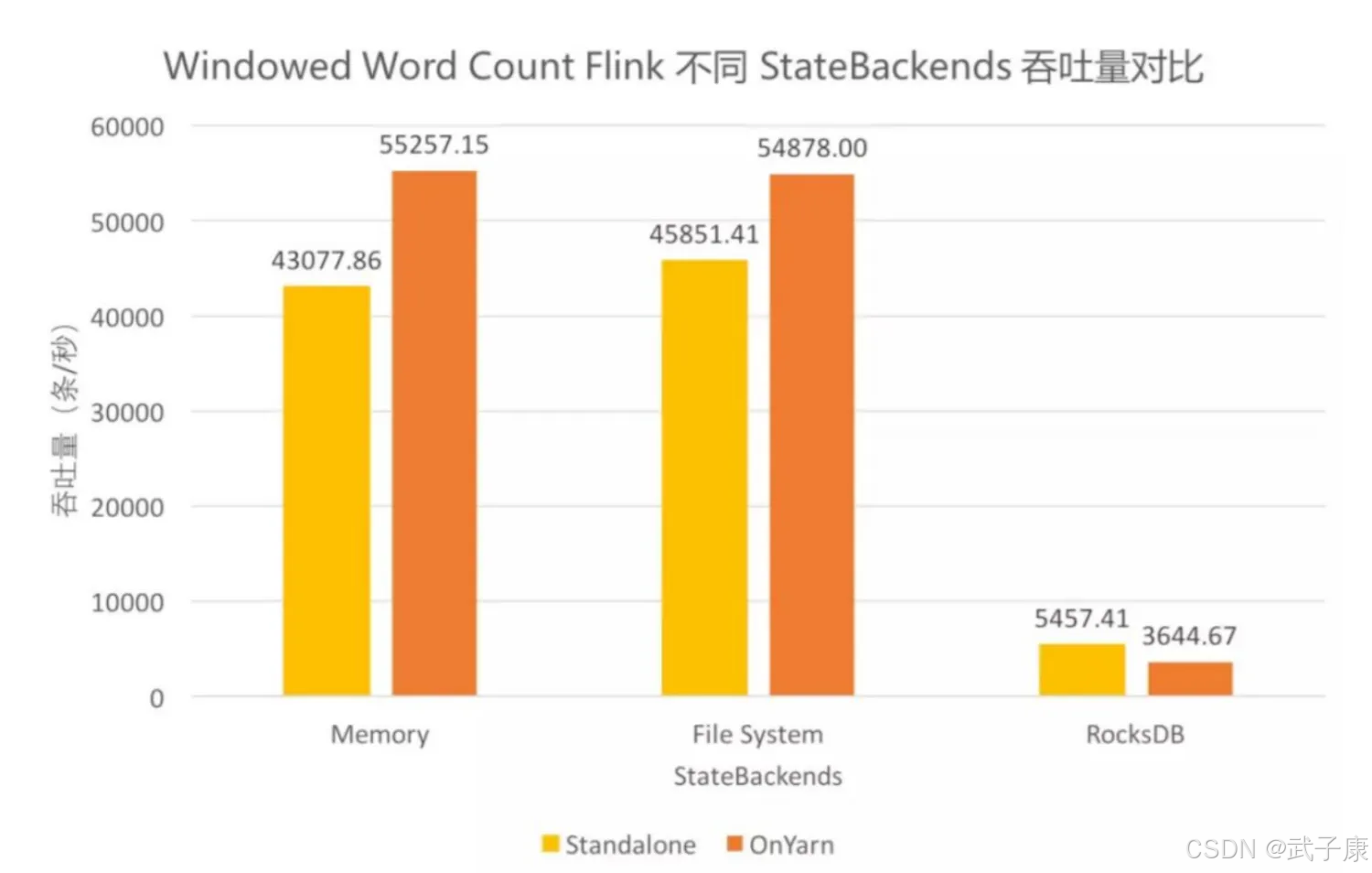 使用 RocksDBStateBackend 时,能够限制状态大小是 TaskManager 磁盘空间(相对于 FsStateBackend 状态大小限制与 TaskManager 内存)。这也导致 RocksDBStateBackend 的吞吐比其他两个要低一些,因为 RocksDB 的状态数据的读写都要经过反序列化/序列化。