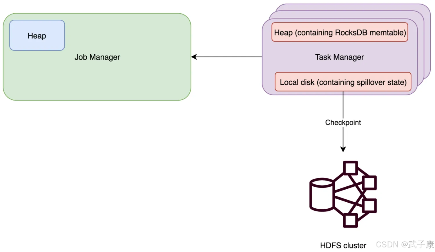 RocksDBStateBackend 也需要配置一个 CheckPoint 路径,例如:hdfs://xxx 或者 file:///xxx,一般是 HDFS 路径。RocksDB 是一种可嵌入的可持久型的 key-value 存储引擎,提供 ACID 支持。由 Facebook 基于 LevelDB 开发,使用 LSM 存储引擎,是内存和磁盘的混合存储。RocksDBStateBackend 将工作状态保存在 TaskManager 的 RocksDB 数据库中,CheckPoint 时,RocksDB 中的所有数据会被传输到配置的文件目录,少量元数据信息保存在 JobManager 内存中(HA 模式下,会保存在 CheckPoint 目录)。RocksDBStateBackend 使用异步方式进行快照,RocksDBStateBackend 的限制:
