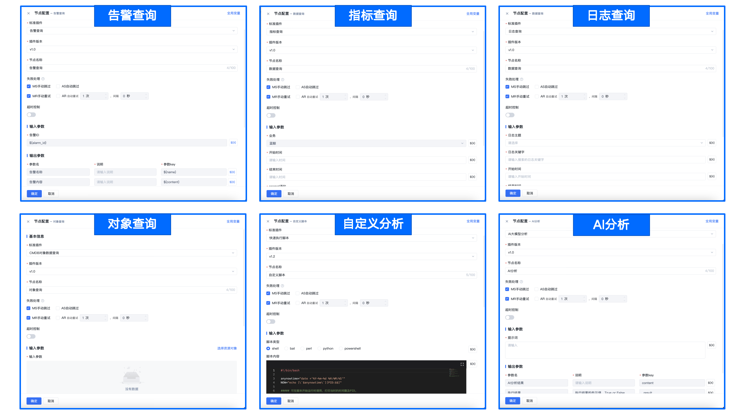 内置丰富排查定位插件,支持可配置化扩展:内置告警数据查询、监控指标查询、日志数据查询、CMDB 对象数据查询、数据统计分析、AI 智能分析等插件,并可根据客户实际需求进行原子插件开发和可配置化扩展。