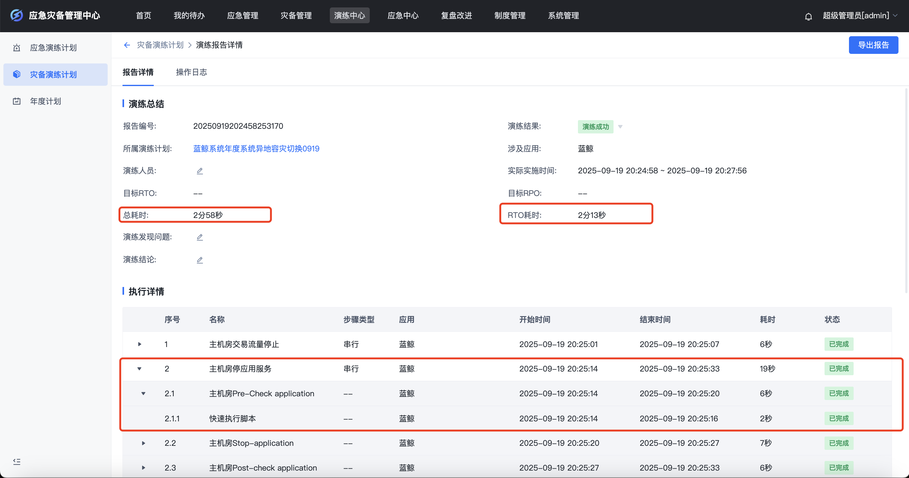 演练报告展示切换执行流程多层级、精细化的耗时统计:支持流程步骤、节点、子节点的耗时统计,支持总耗时和 RTO 耗时统计,支持部分步骤耗时不计入 RTO 耗时统计。