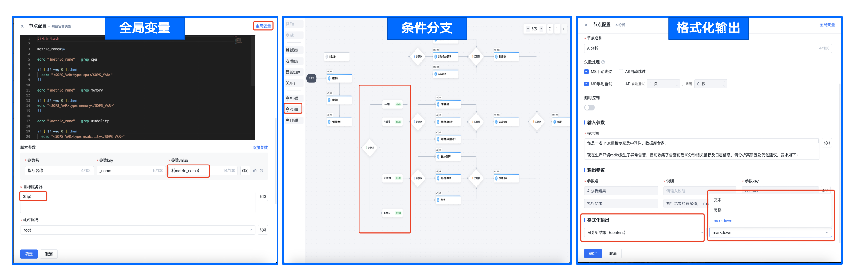 支持全局变量、条件分支和格式化输出:支持全局变量与上下文传参,支持条件分支判断,保证最小化的输入与精细化的条件分支决策;支持输出参数的格式化输出,包括文本、表格、markdown 三种格式,保证输出数据的可读性。