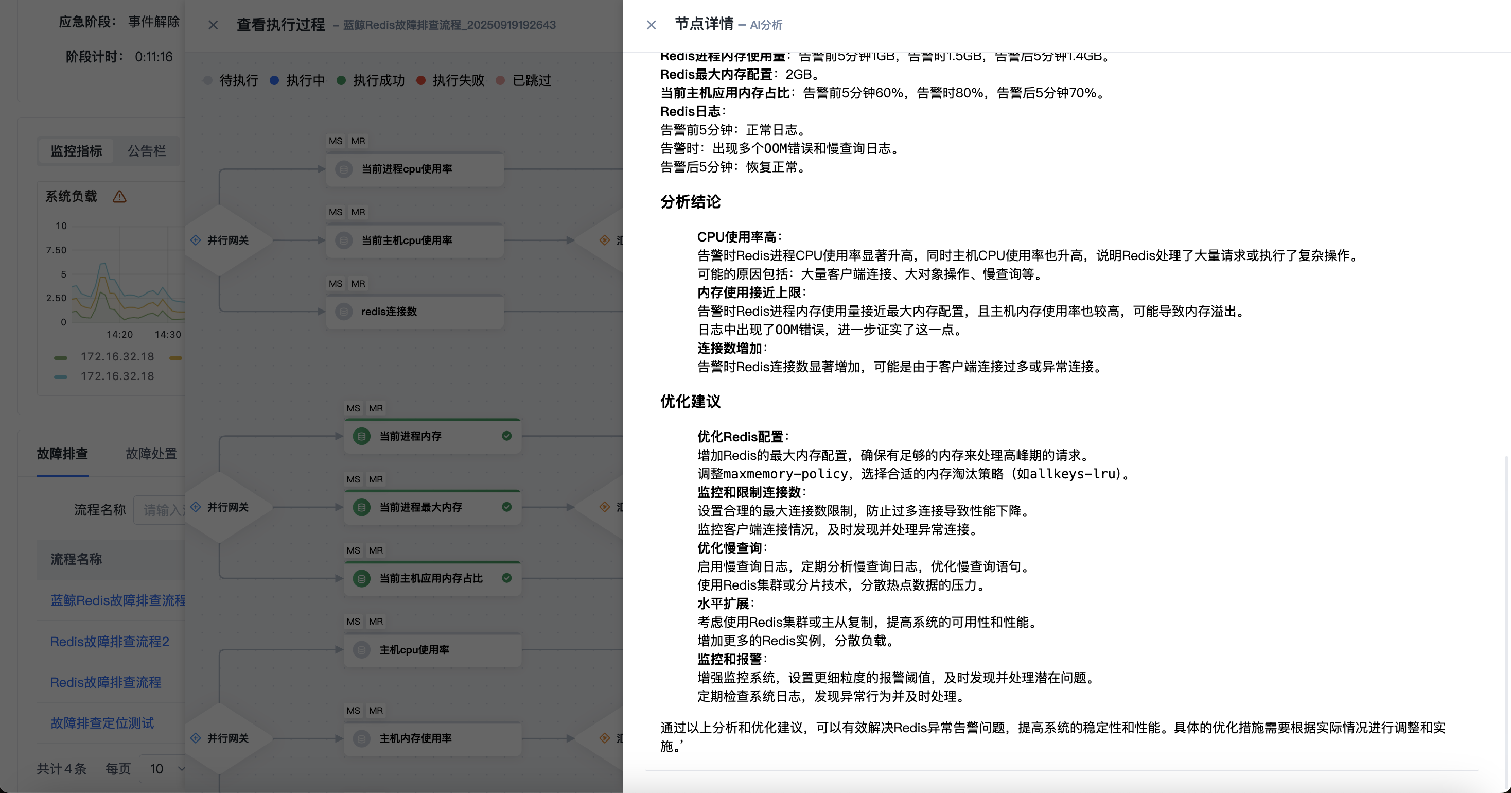 通过沉淀运维专家排查诊断经验并结合 AI 大模型智能分析总结,可实现已知故障场景的精准定位,通过一键式执行,大大提升排查定位效率。