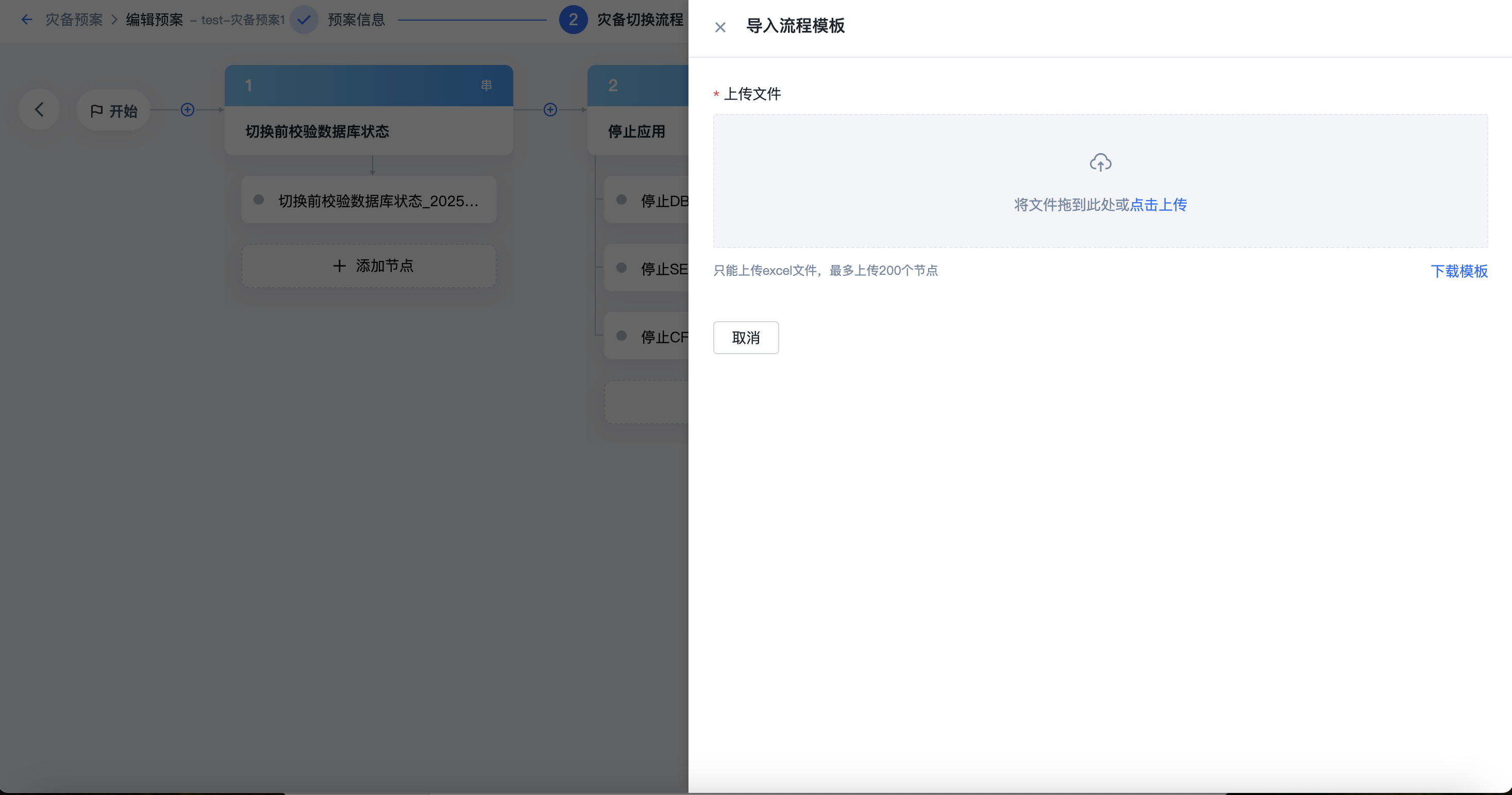 灾切流程一键式导入:支持通过 excel 流程模板导入自动生成系统切换流程,简化用户操作,提升用户使用体验。