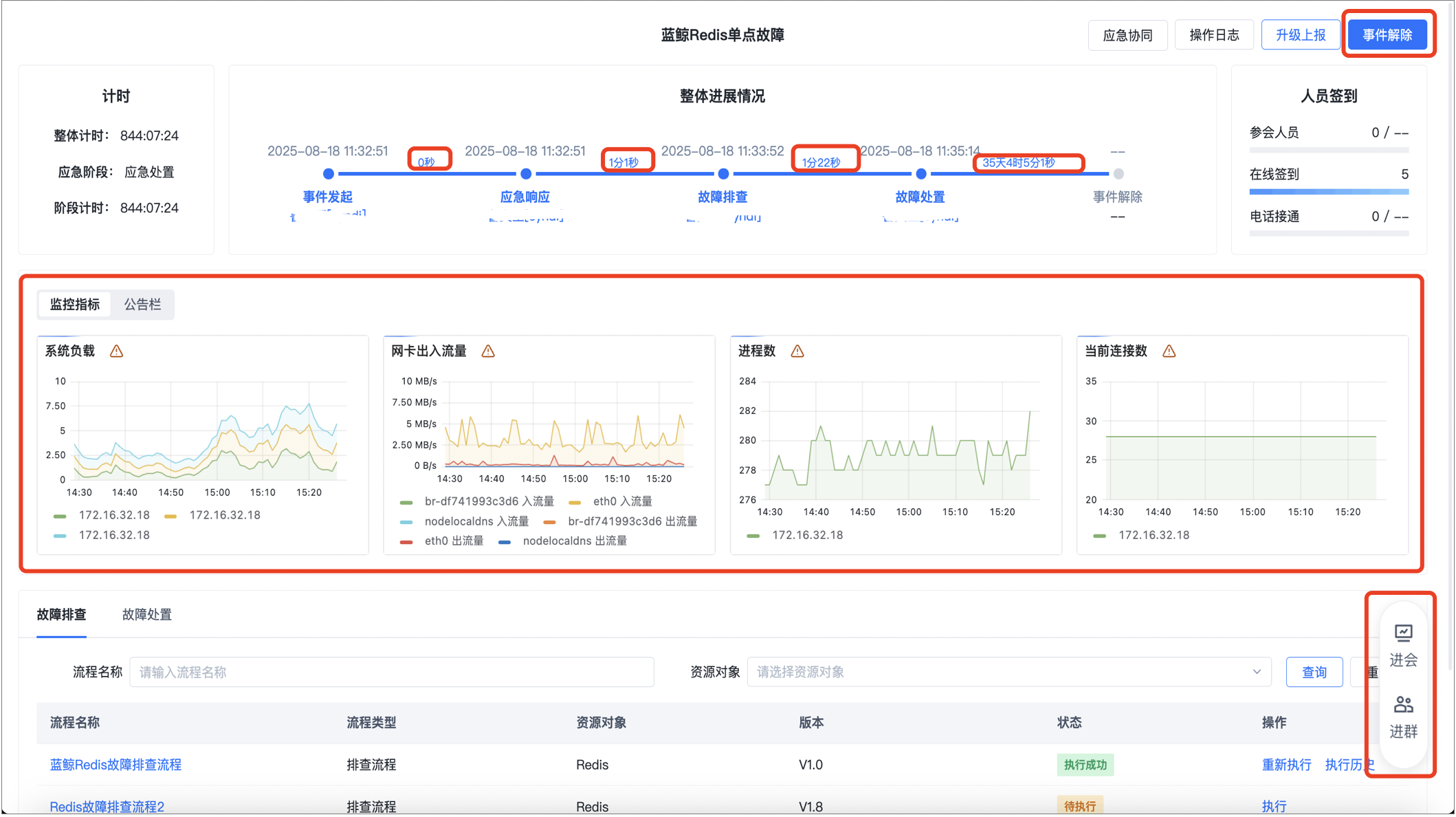 业务指标观测、阶段计时、主动进群进会、自动生成 ITSM 故障单:丰富和完善应急事中能力,包括业务指标观测、应急各阶段计时、一键建群拉会之后的主动进群进会、事件解除时自动创建 ITSM 故障单等功能,提供一站式应急服务。