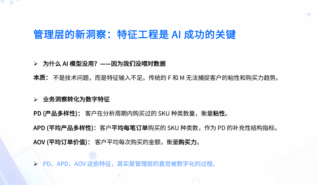 特征工程:AI 成功的关键模型失效的根源往往并非算法,而是特征输入未能反映业务洞察。课程以新的三个特征而非传统 RFM 特征展开: