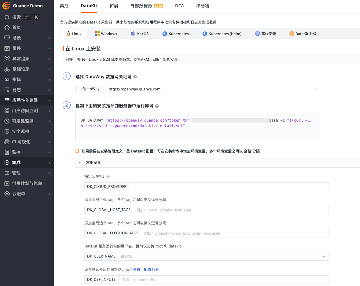 登录观测云控制台,点击「集成」 -「DataKit」 - 「Linux」,复制安装命令,在主机中可以一键安装。