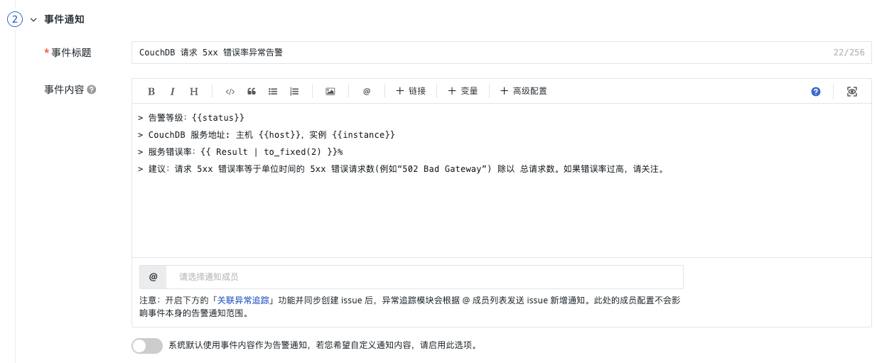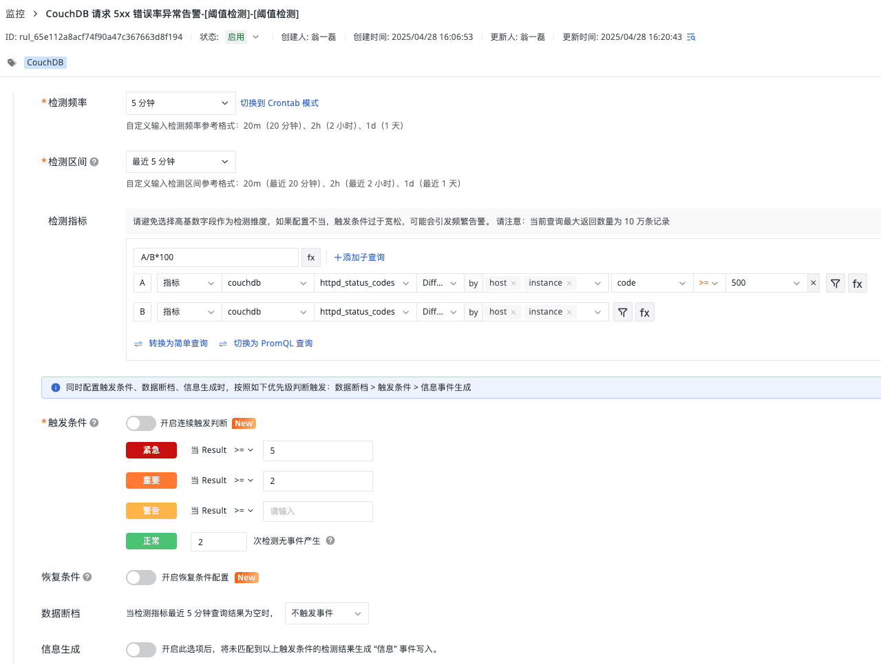 针对 CouchDB 服务器请求的异常(4xx 和 5xx),以及响应时间,进行监控告警。