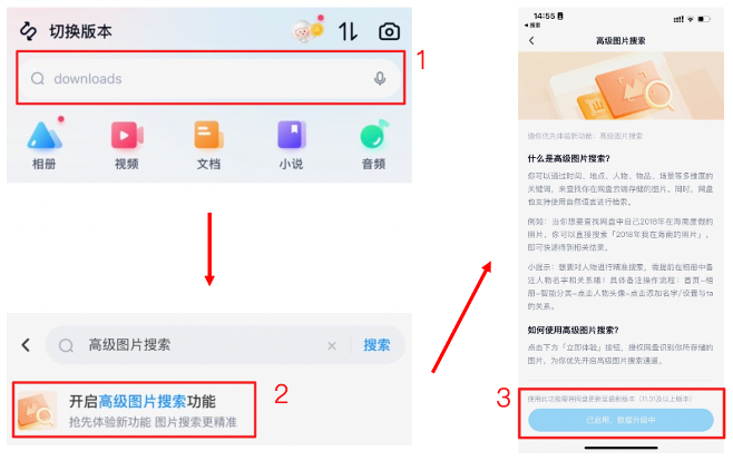 在百度网盘,搜索“高级图片搜索”,点击“开启高级图片搜索功能”,点击“立即体验”,等待图片计算并建立索引后即可体验,我们会在计算完成后发送 PUSH 提醒。