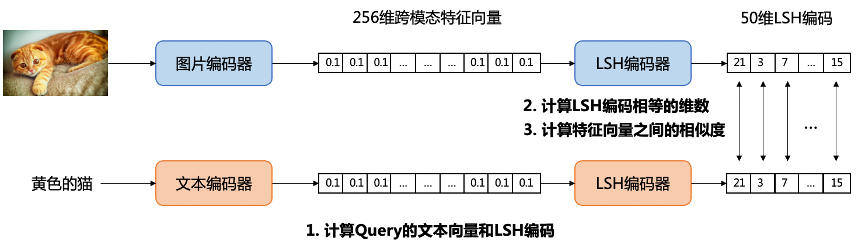 1、请求云端计算文本“黄色的猫”的特征向量和 LSH(Locality-Sensitive Hashing,局部敏感哈希)编码;
