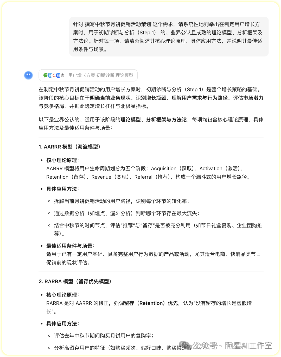 同样都是做策划,比文章开头的一句话提问要详细的多,AI 收到这么详细的规定后可以为你增补很多理论模型作为回答参考——