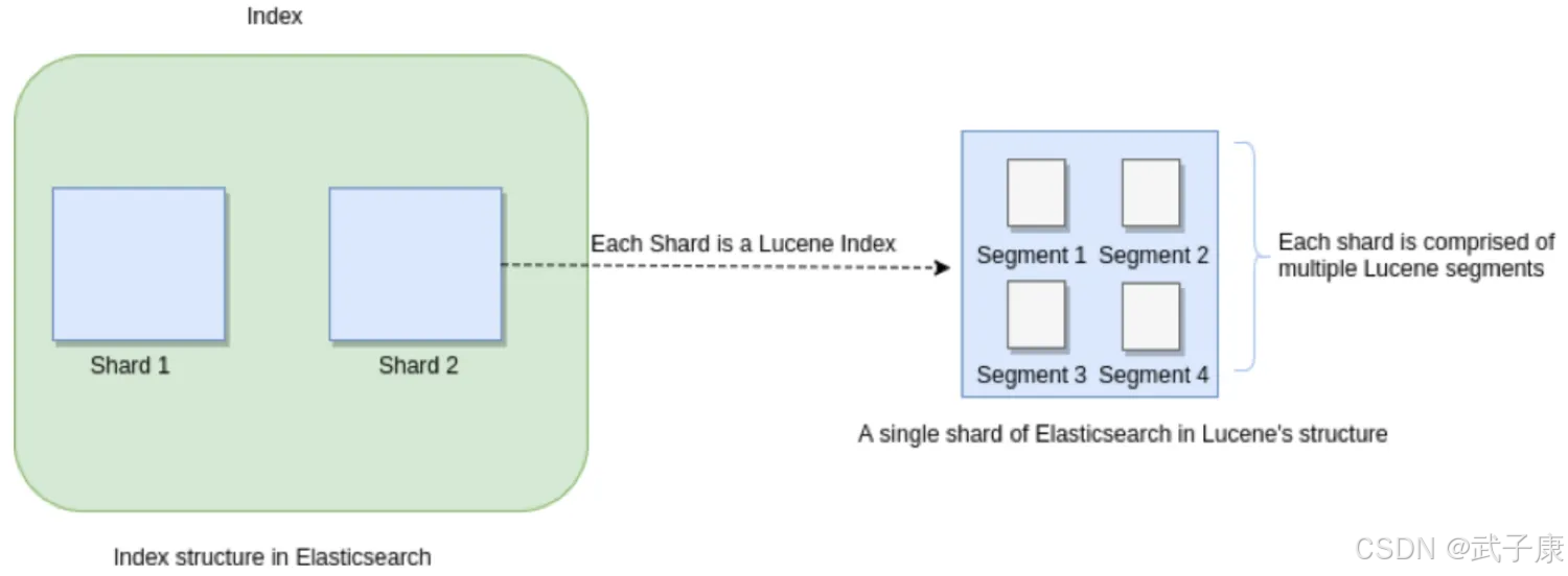 众所周知,Elasticsearch 存储的基本单元是 Shard,ES 中的一个 Index 可能分为多个 Shard,事实上每个 Shard 都是一个 Lucence 的 Index,并且每个 LucenceIndex 由多个 Segment 组成,每个 Segment 事实上是一些倒排索引的集合,每次创建一个新的 Document,都会归属于一个新的 Segment,而不会去修改原来的 Segment。且每次的文档删除操作,会仅仅标记 Segment 中该文档为删除状态,而不会真正的立马物理删除,所以说 ES 的 index 可以理解为一个抽象的概念。就像下图所示: