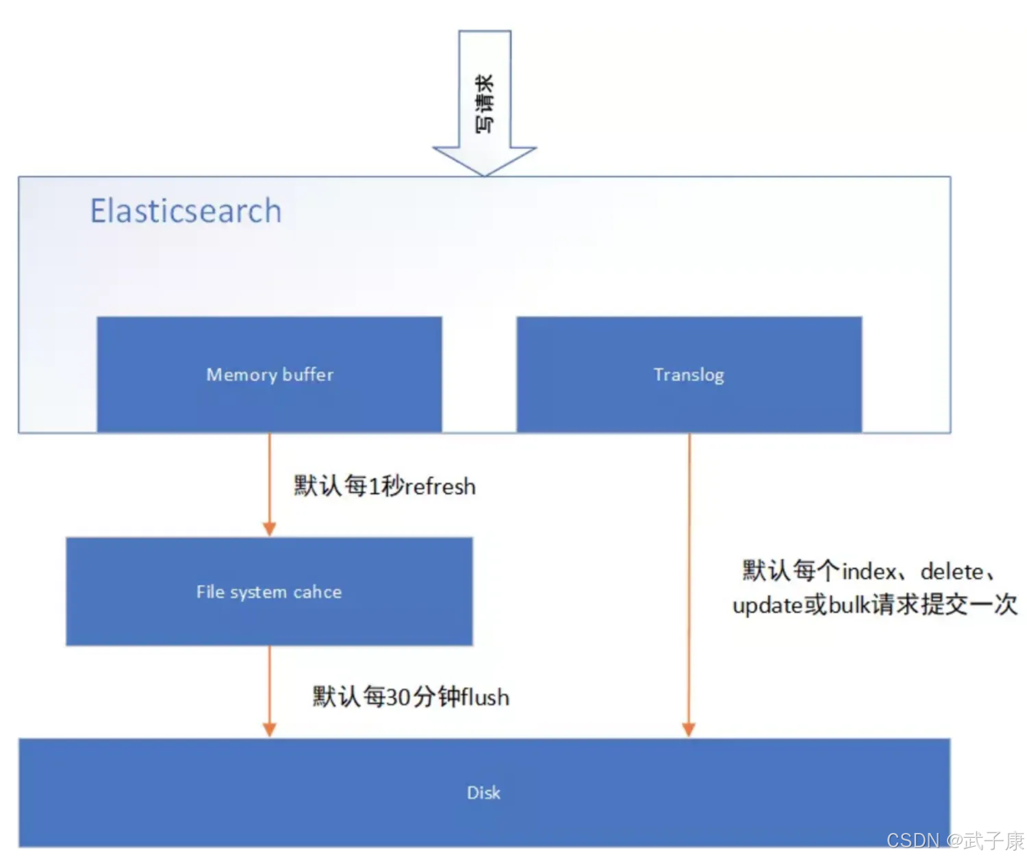 Elasticsearch 写入流程,当一个写请求到达 Elasticsearch 后,ES 将数据写入 MemoryBuffer 中,并添加事务日志(translog)。如果每次一条数据写入内存后立即写到硬盘上,由于写入的数据肯定是离散的,因此写入磁盘的操作也就是随机写入了。硬盘随机写入的效率相当低,会严重降低 ES 的性能。因此 ES 在设计时在 MemoryBuffer 和硬盘之间加入了高速缓存(FileSystemCache)来提高 ES 的写效率。当写请求发送到 ES 后,ES 将数据写入 MemoryBuffer 中,此时写入的数据还不能查询到。默认设置下,ES 每 1 秒钟将 MemoryBuffer 中的数据 Refresh 到 Linux 的 FileSystemCache,并清空 MemoryBuffer,此时写入的数据就可以被查询到了。