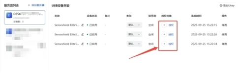 选择刚刚添加的 USB 服务器,点击“将 Ukey 添加到设备列表中”按钮,选择深思加密锁。将锁添加到控制台后,再将它们授权给具体成员。
