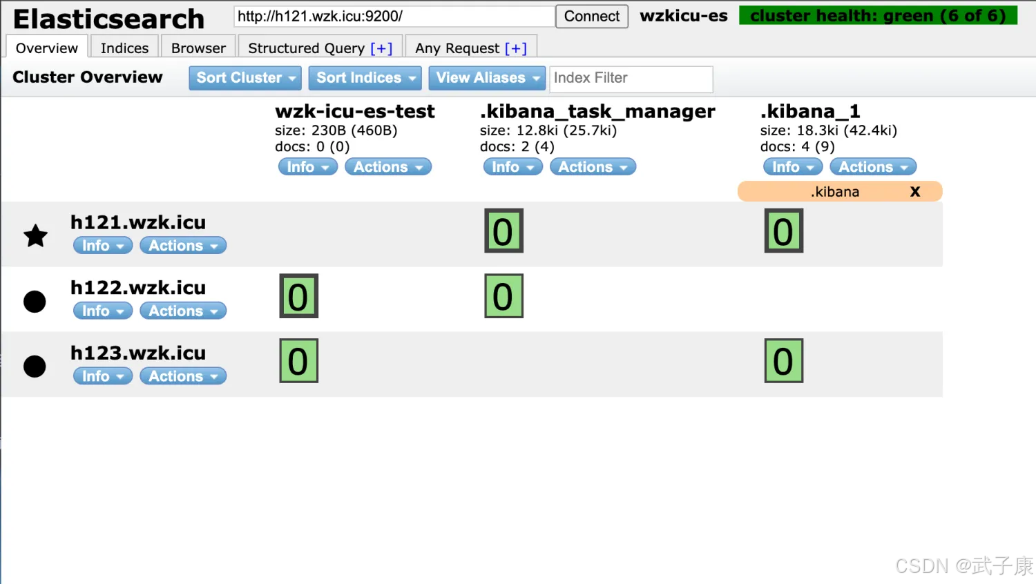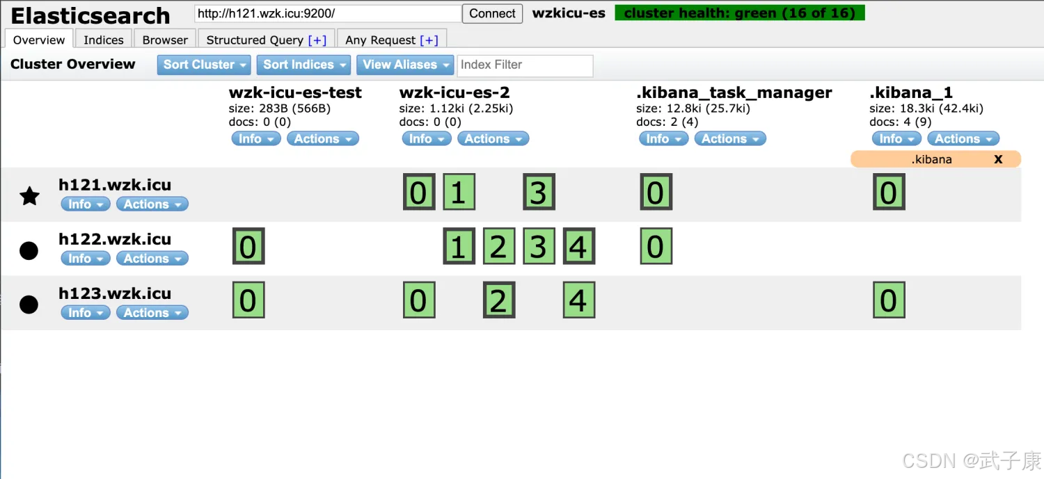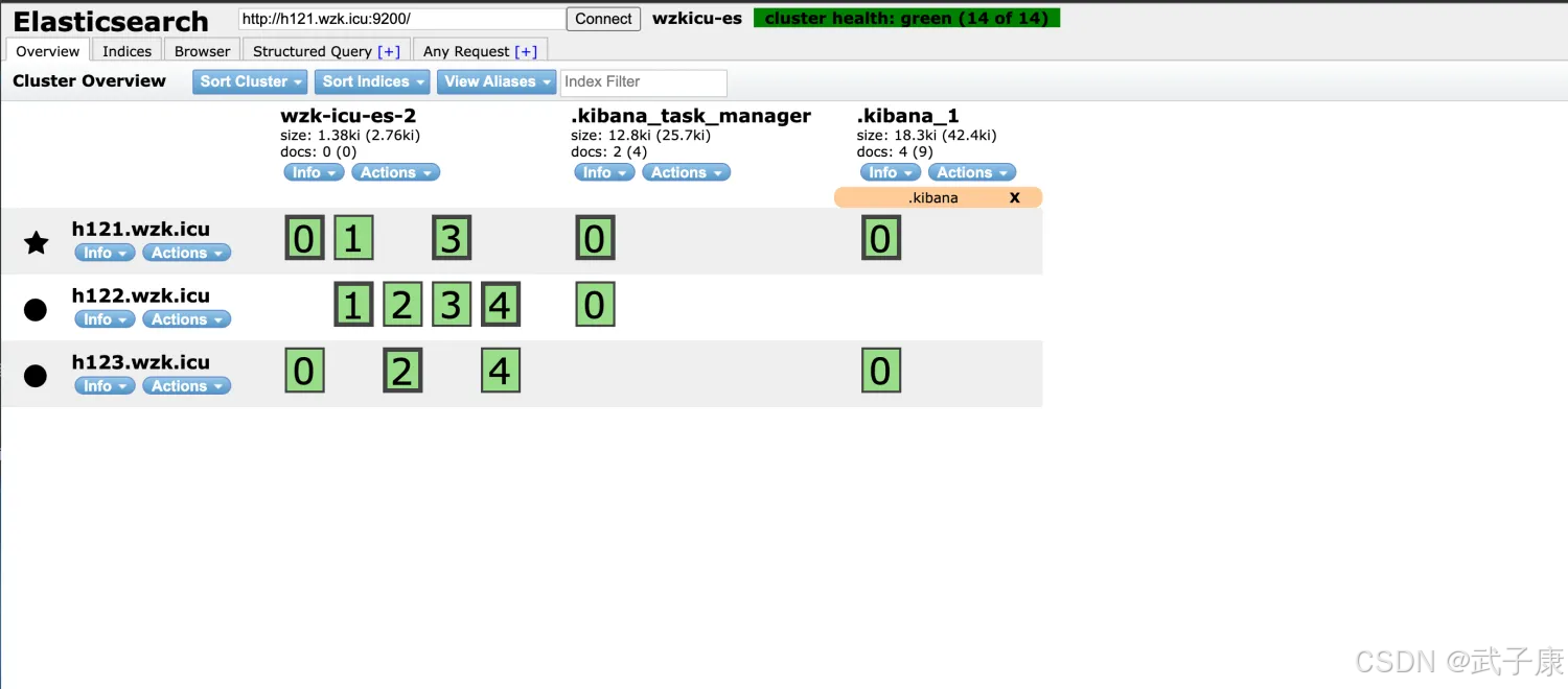 Elasticsearch-Head 查看,可以看到刚才创建的 ES 索引,分片的分布情况如下: