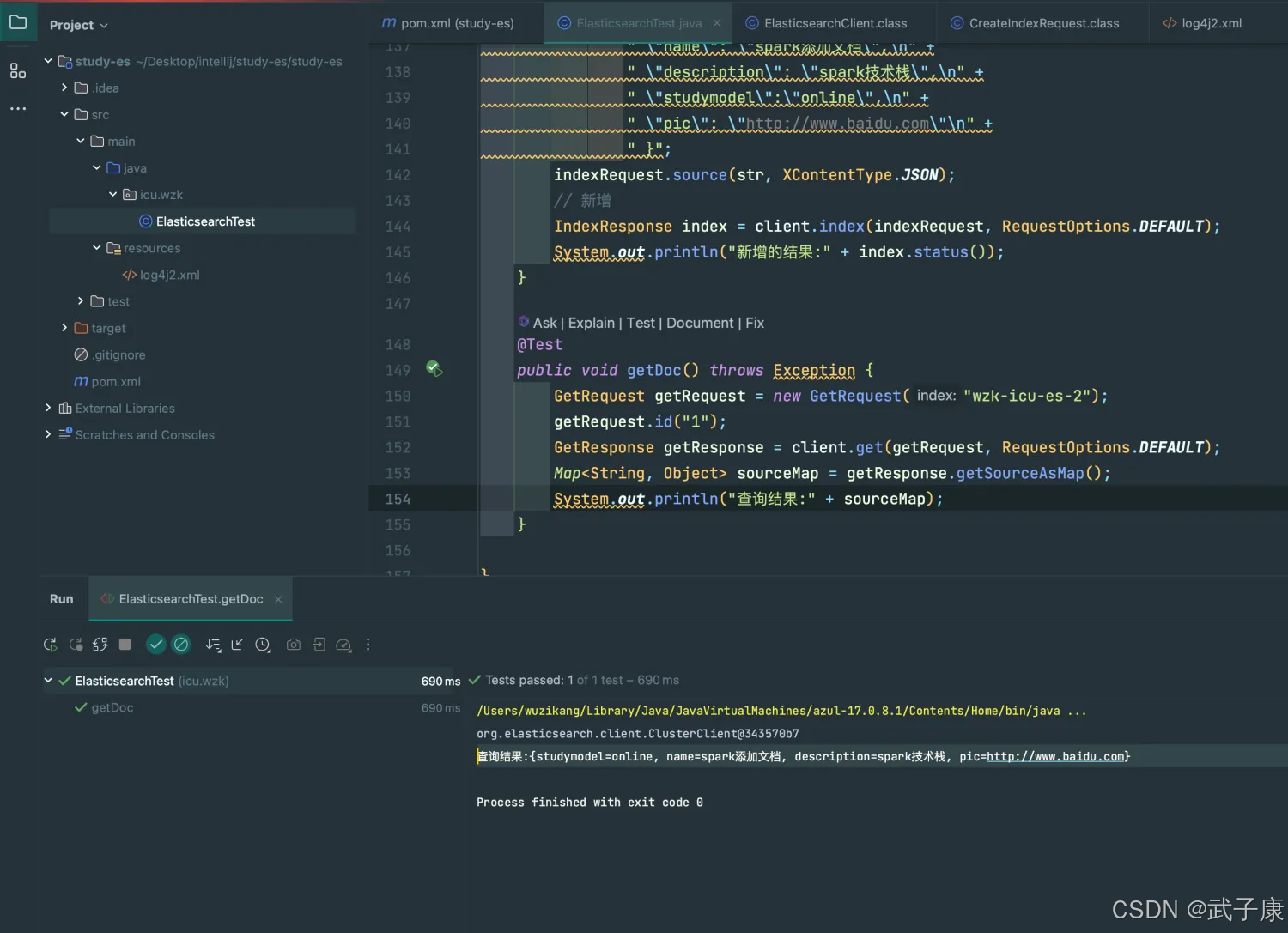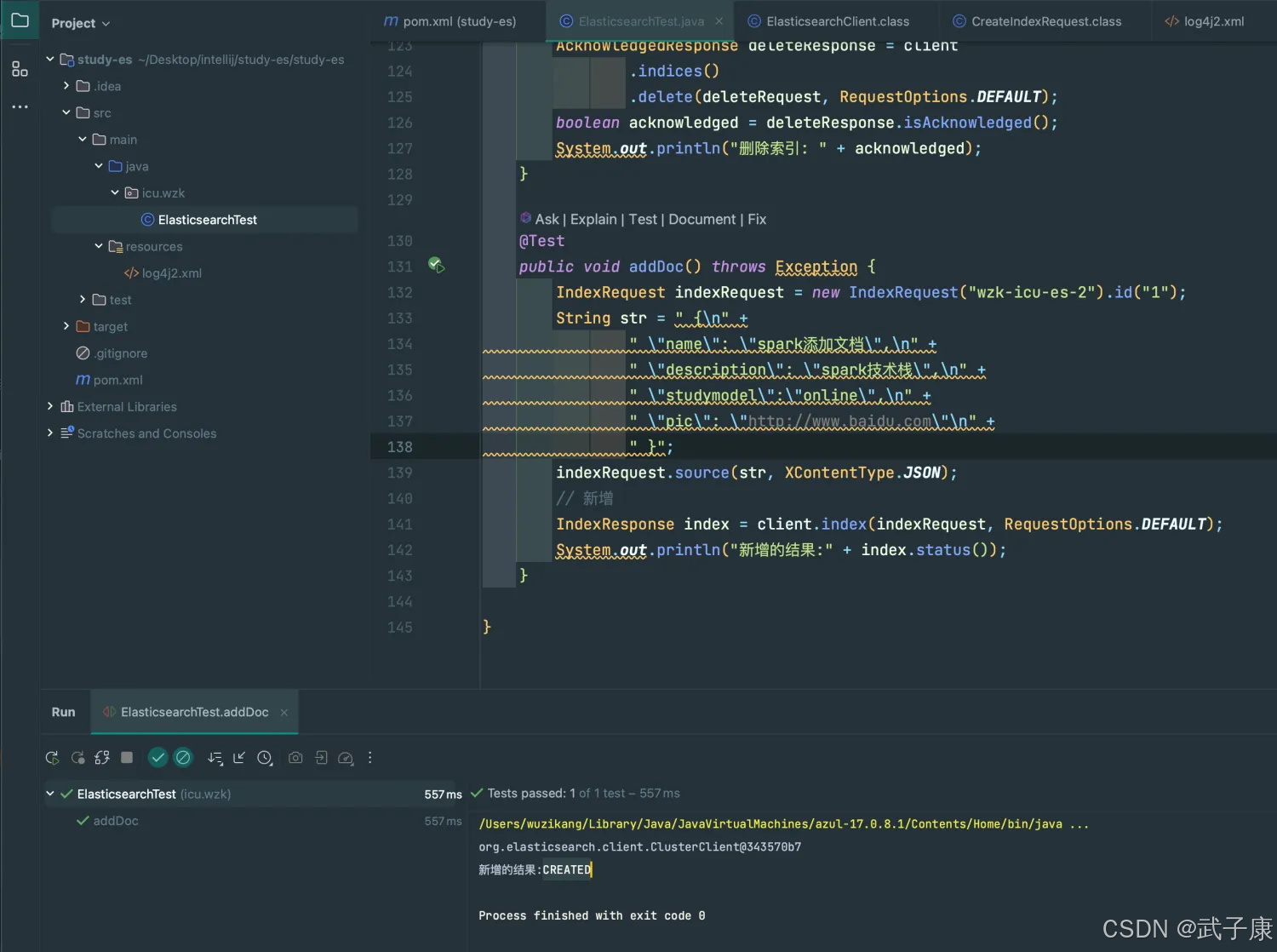 @Testpublic void addDoc() throws Exception { IndexRequest indexRequest = new IndexRequest("wzk-icu-es-2").id("1"); String str = " {\n" + " \"name\": \"spark添加文档\",\n" + " \"description\": \"spark技术栈\",\n" + " \"studymodel\":\"online\",\n" + " \"pic\": \"http://www.baidu.com\"\n" + " }"; indexRequest.source(str, XContentType.JSON); // 新增 IndexResponse index = client.index(indexRequest, RequestOptions.DEFAULT); System.out.println("新增的结果:" + index.status());}