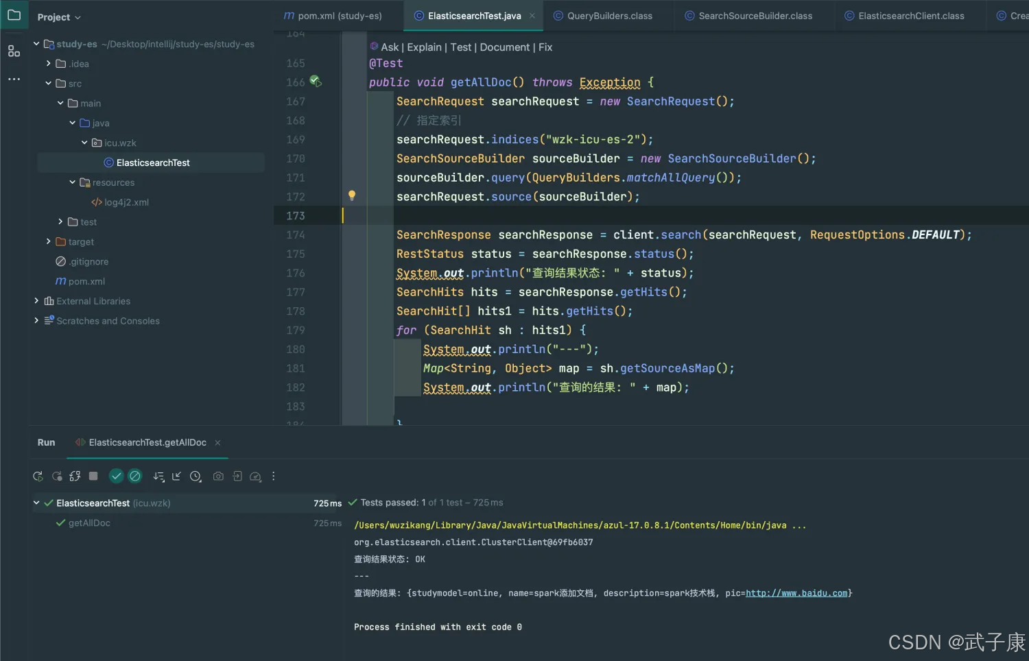 @Testpublic void getAllDoc() throws Exception { SearchRequest searchRequest = new SearchRequest(); // 指定索引 searchRequest.indices("wzk-icu-es-2"); SearchSourceBuilder sourceBuilder = new SearchSourceBuilder(); sourceBuilder.query(QueryBuilders.matchAllQuery()); searchRequest.source(sourceBuilder);