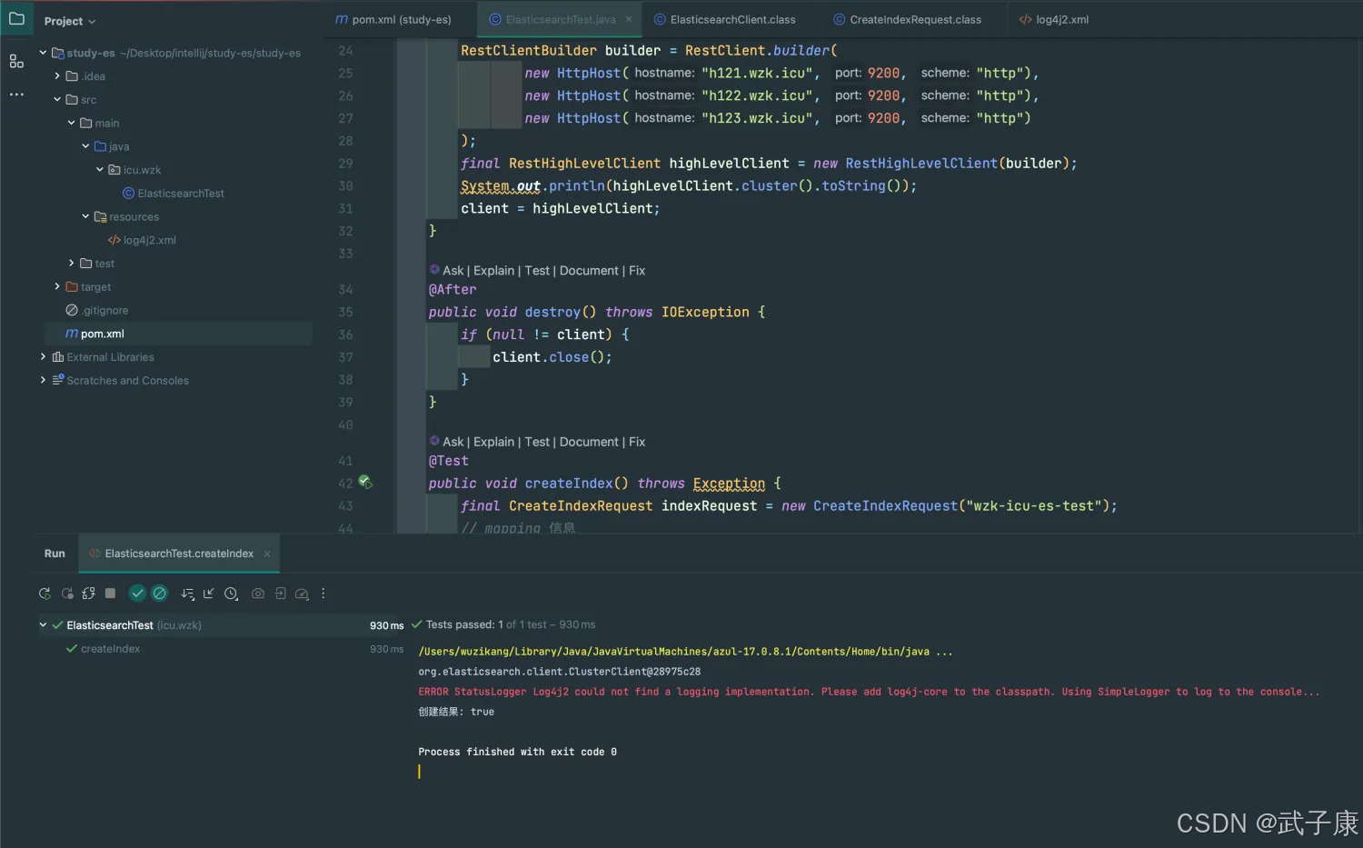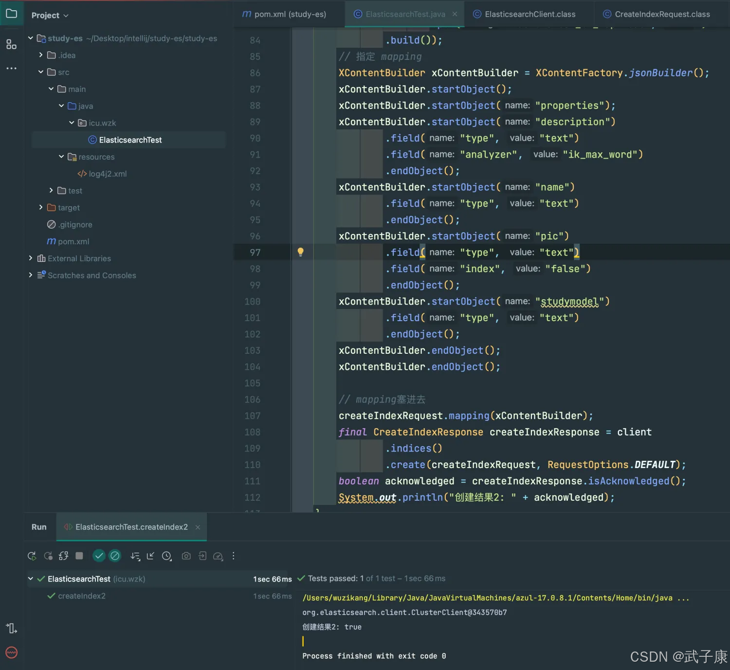 @Testpublic void createIndex() throws Exception { final CreateIndexRequest indexRequest = new CreateIndexRequest("wzk-icu-es-test"); // mapping 信息 // mapping 信息 String mapping = "{\n" + " \"settings\": {},\n" + " \"mappings\": {\n" + " \"properties\": {\n" + " \"description\": {\n" + " \"type\": \"text\",\n" + " \"analyzer\": \"ik_max_word\"\n" + " },\n" + " \"name\": {\n" + " \"type\": \"text\"\n" + " },\n" + " \"pic\": {\n" + " \"type\": \"text\",\n" + " \"index\": false\n" + " },\n" + " \"studymodel\": {\n" + " \"type\": \"text\"\n" + " }\n" + " }\n" + " }\n" + "}"; indexRequest.source(mapping, XContentType.JSON); // 创建索引 CreateIndexResponse indexResponse = client.indices().create(indexRequest, RequestOptions.DEFAULT); boolean acknowledged = indexResponse.isAcknowledged(); System.out.println("创建结果: " + acknowledged);}