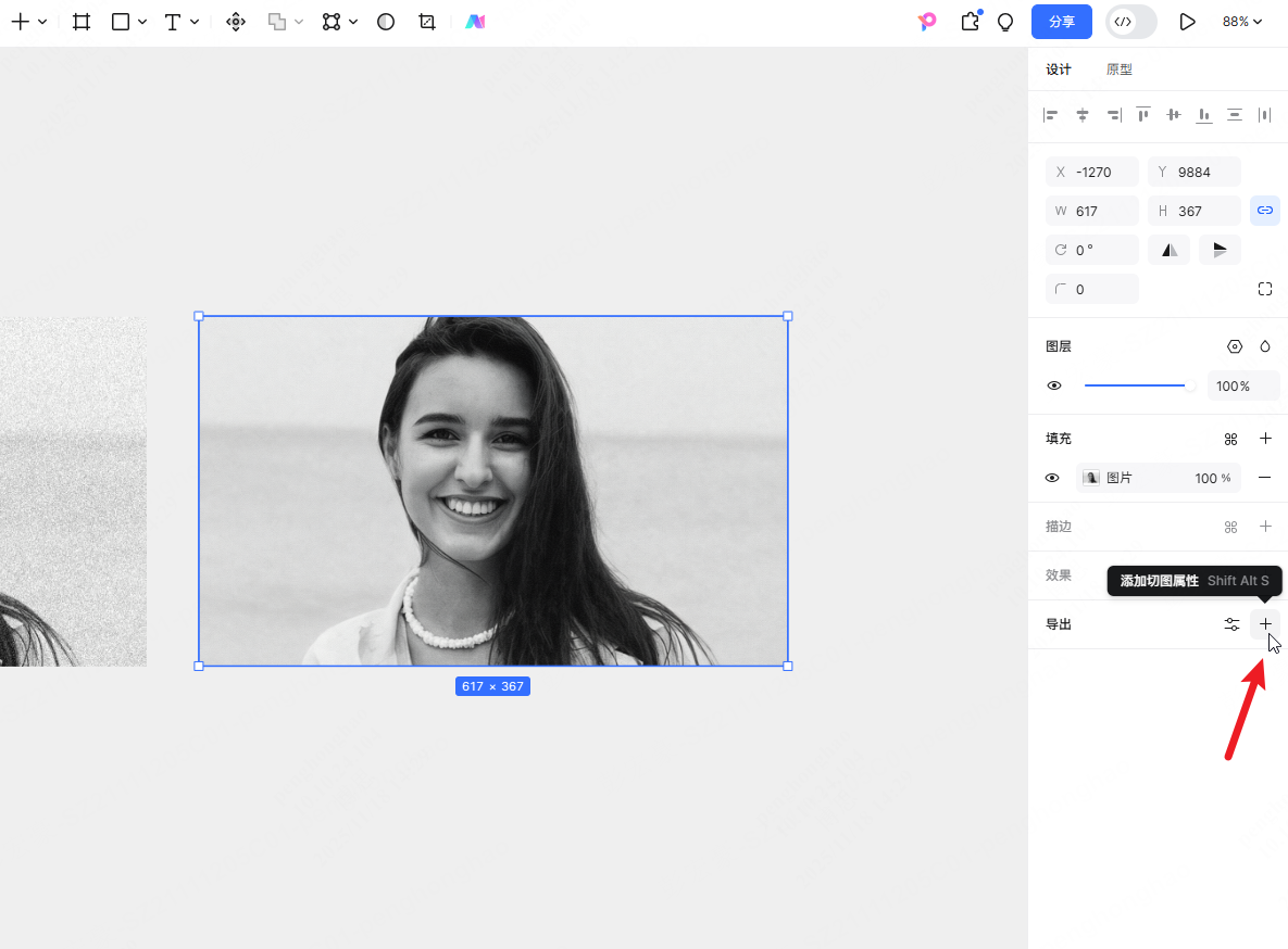 得到清晰照片后,单击选中图片,点击【导出】右侧的“添加切图属性”,默认应用导出 1 倍图(1X)、PNG 格式的配置,若无其他需求,点击下方的【导出】按钮,即可将清晰图片下载到本地。