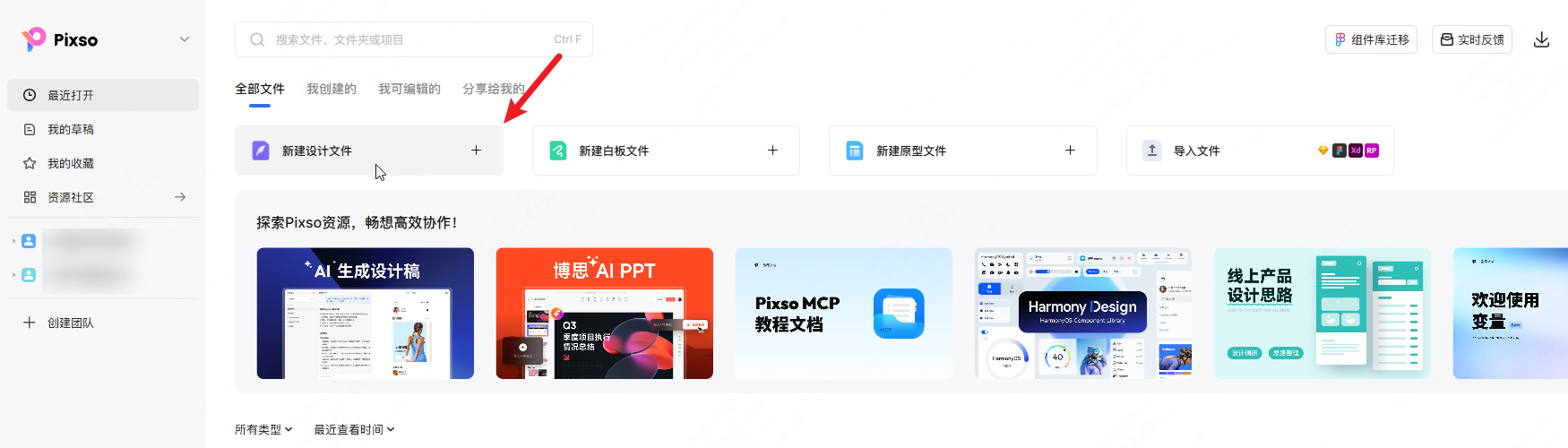 在浏览器打开设计工具 Pixso 首页,进入到 Pixso 工作台,点击“新建设计文件”。