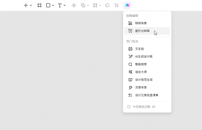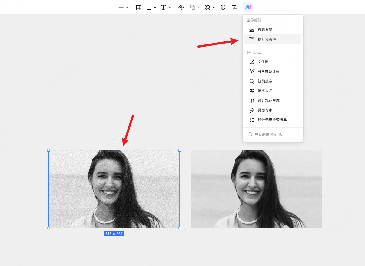进入刚创建的 Pixso 设计文件,将模糊图片直接拖拽到 Pixso 画布中,选中图片,点击顶部工具栏的 AI 图标,选择“提升分辨率”,稍等一小会,Pixso AI 能够让照片模糊瞬间变清晰,如下所示。