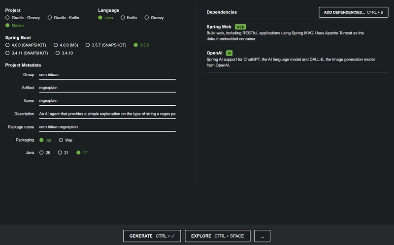 我使用 Spring 提供的初始化工具来初始化项目。请注意,我在依赖项中包含了 Spring Web 和 Open AI。